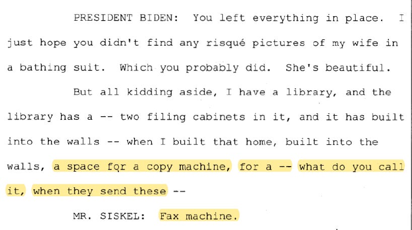 President Biden discussing boxes of materials: “in 2009, am I still Vice President?” (His lawyers had to whisper the answer to him.)