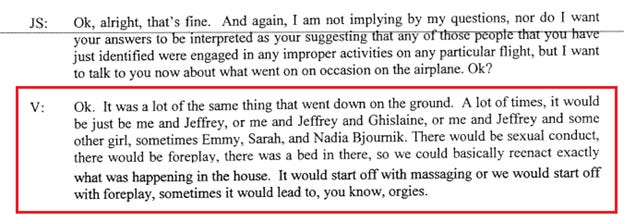 One name to watch out for, however, is Sarah Kellen. She’s in the Epstein plea deal, having been a regular on Epstein’s flights and was a leader in the operation to groom minor girls for Epstein. Kellen is alleged to have been involved in the alleged sexual abuse on Epstein’s airplanes by one victim: