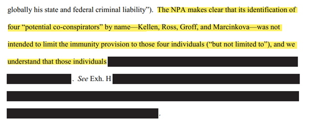 We focuses on those “known and unknown co-conspirators” for a moment. In August 2020 the government informed the Court that their investigation into Epstein’s possible co-conspirators “remains active” and was before the grand jury: