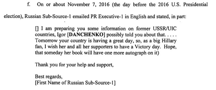 “Russian Sub-Source-1” had a personal interest in a Hillary Clinton victory, stating that the Democrat PR executive (Dolan) would “take me to the State Department if Hillary wins.”