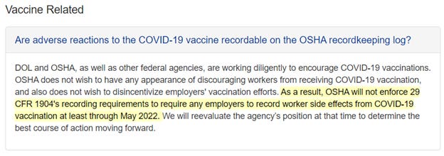 This legal maneuvering, which lessens OSHA’s evidentiary and fact-finding burdens, should be no surprise. OSHA (like Biden himself) has a long history of unlawfulness and of ignoring its own regulations. Most recently, the agency is refusing to enforce its own rules requiring employers who mandate vaccinations from recording the side effects.