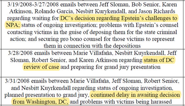 These victim notification letters, which would inform them of Epstein’s plea deal and afford them the right to be heard at any plea or sentencing hearing, were rights conferred by the Crime Victims’ Rights Act. The upper levels of the DOJ, in conjunction with local prosecutors and Epstein’s defense team, conspired to deny these rights.