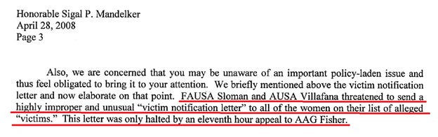 These appeals worked. According to April 2008 correspondence from Starr to Deputy Assistant Attorney General Sigal Mandelker, the victim notification letters were “halted by an eleventh hour appeal to AAG Fisher.”