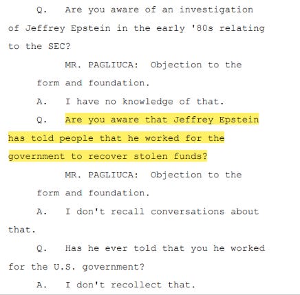 Adding to the intrigue is this excerpt we reported from Ghislaine Maxwell’s deposition, where Epstein had reportedly told people he worked for the US government to “recover stolen funds.”
