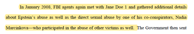 Approximately four months after Epstein signed the NPA, the FBI met with a victim and gathered “additional details about Epstein’s abuse as well as the direct sexual abuse by one of his co-conspirators, Nadia Marcinkova – who participated in the abuse of other victims as well.” (Unfortunately for the victims, Ms. Marcinkova was protected from prosecution by the Epstein NPA.)