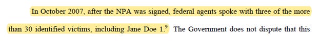 For example, court filings indicate that “In October 2007, after the NPA was signed, federal agents spoke with three of the more than 30 identified victims.”