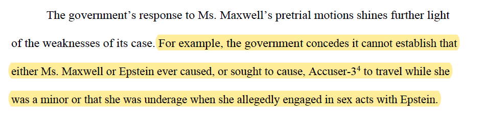 First, Maxwell makes the accusation that “the government concedes it cannot establish that either Ms. Maxwell or Epstein ever caused, or sought to cause, Accuser-3 to travel while she was a minor or that she was underage when she allegedly engaged in sex acts with Epstein.”