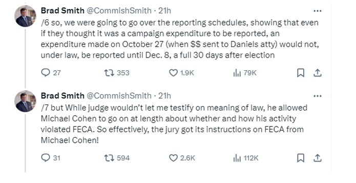 Former FEC Commissioner Brad Smith was to be called by Trump – until Judge Merchan restricted his testimony on the complexities of the Federal Election Campaign Act. What Smith could discuss would have been so limited that he was scratched as a witness. According to Smith, he was going to share how election laws have been interpreted, such as expenditures made or acts done “for the purpose of influencing an election.” He would have also explained reporting requirements and how those would have been due after the election.