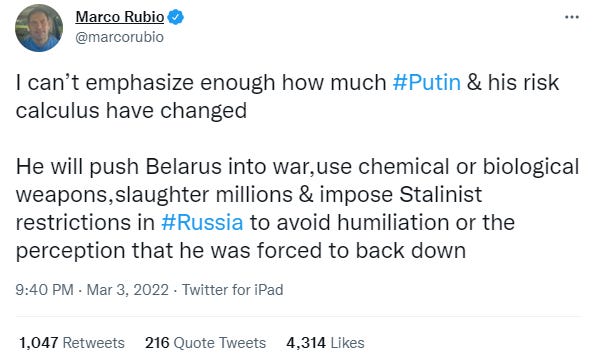 Florida Senator Marco Rubio soon followed with claims that Putin would “use chemical or biological weapons” and “slaughter millions.” This same Marco Rubio has been a proponent of NATO expansion - the very policy that contributed to the environment that led to Russia’s invasion.