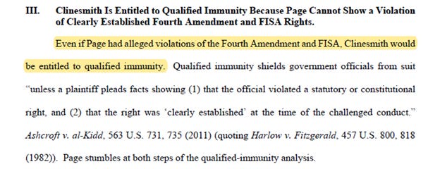 Clinesmith’s argument in his motion to dismiss? That despite pleading to the crime relating to the FISA warrant, he is entitled to “qualified immunity.”