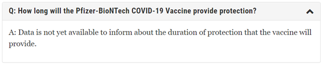 Flying under the radar is an admission made by the FDA regarding the durability of the one COVID-19 vaccine – the Pfizer vaccine (under the name COMIRNATY) – that was officially “approved”: “data is not yet available to inform about the duration of protection that the vaccine will provide.”