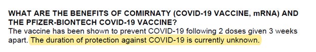 And as we previously discussed, the FDA’s approval of COMIRNATY was suspicious for a number of reasons, including because the COMIRNATY fact sheet admits “The duration of protection against COVID-19 is currently unknown.”