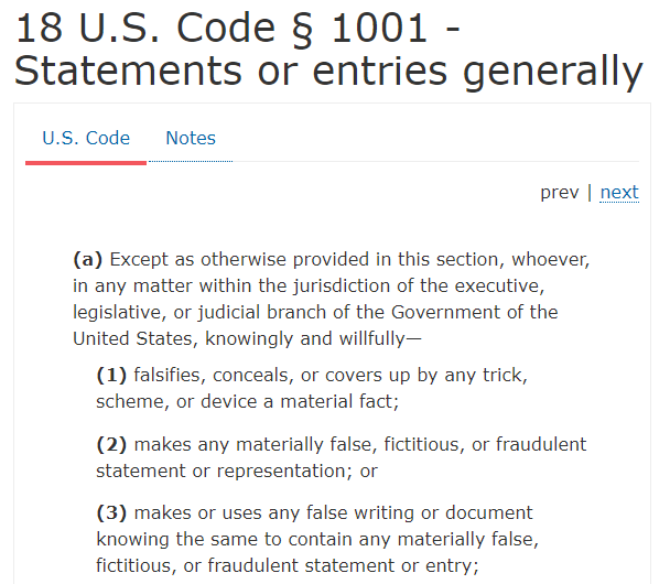 Powerline also mentions the potential for a false statements charge under 18 USC § 1001, which provides: