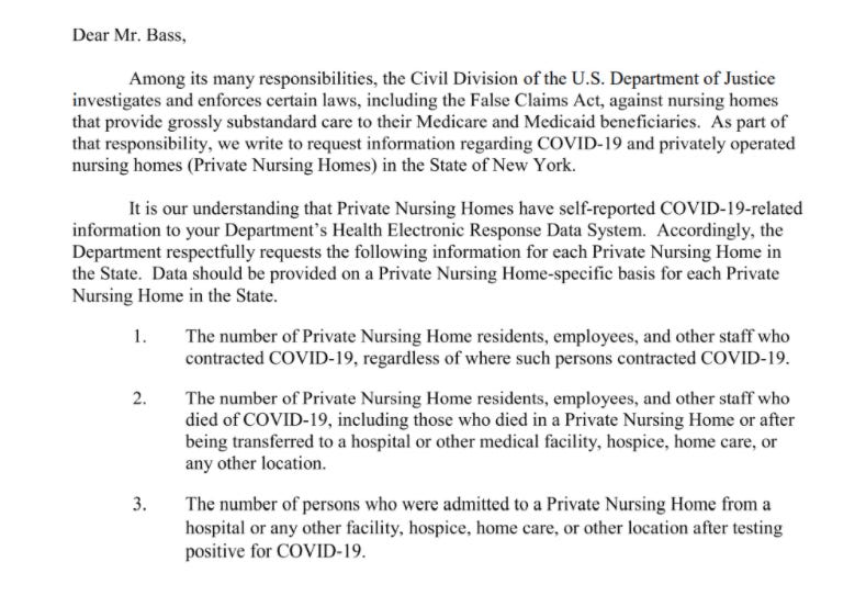 As we previously discussed, officials with the DOJ Civil Division in October 2020 sought information on “grossly substandard care” given to New York nursing home residents.