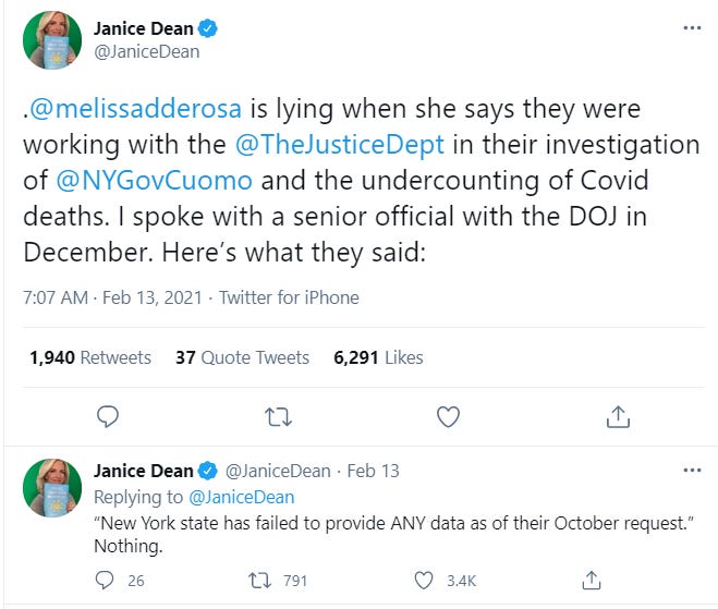 The last reporting on the DOJ investigation had been from October 28, 2020, where it was confirmed that the DOJ was ramping up its inquiry into NY nursing home deaths. From Cuomo’s press conference it looks like NY had been periodically providing more information to the DOJ. Janice Dean reports that no information had been provided by late December 2020. No doubt Cuomo’s administration slowed production until after the 2020 election (and immediately before inauguration), trusting the Biden DOJ to drop the investigation of its political ally.