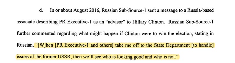 It also means that the FBI likely possessed this information that Danchenko’s source was a huge Hillary Clinton fan and hoping for a job in the Clinton State Department.