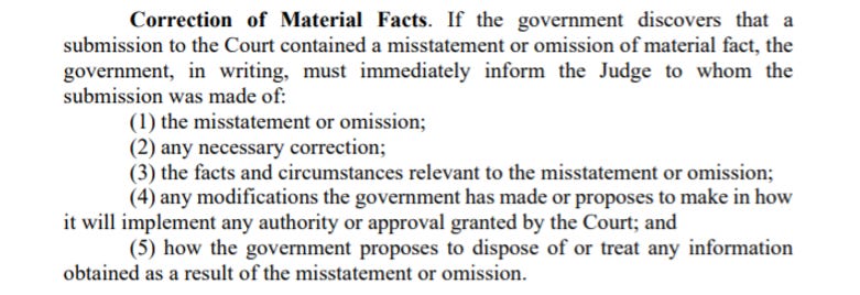 Back to the FISA Court. This Court operates in secret, with no chance for the accused to present their defense or the public to review warrant applications. With this in mind, the Court demands honesty from the government.