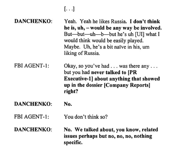 On June 15, 2017, the FBI interviewed Danchenko regarding the Dossiers (labeled “Company Reports” in the indictment). Here’s the line of questioning from the indictment: