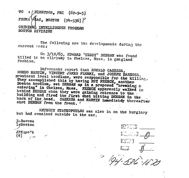 Deegan’s death had the criminal world talking. On March 13, 1965 (the day after the murder), a top FBI informant reported that Jimmy Flemmi confessed to murder along with French, Romeo, Martin, Cassesso, and Barboza.