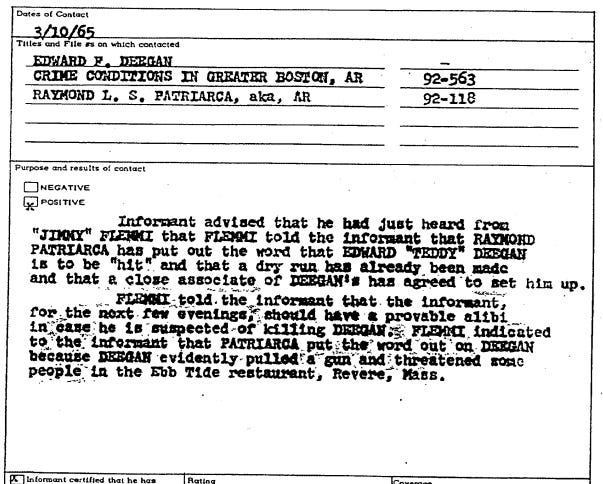 Two days prior to Deegan’s murder, on March 10, 1965, an informant advised the FBI that Raymond Patriarca, a powerful New England organized crime boss, had ordered a “hit” on Deegan. They had already completed a dry run and “a close associate of Deegan’s has agreed to set him up.” The FBI knew it was coming.